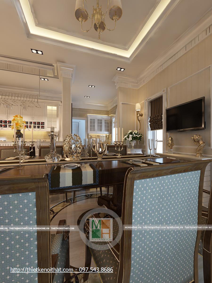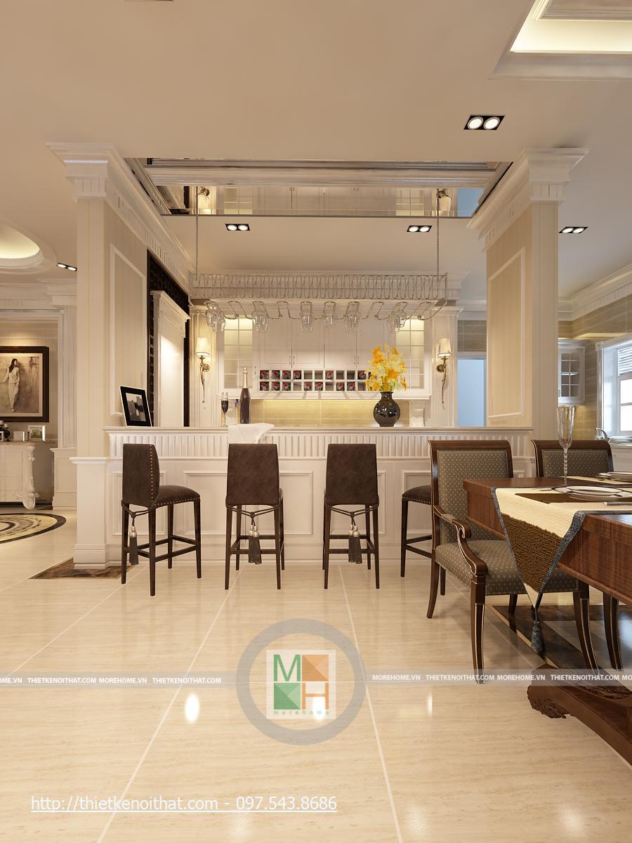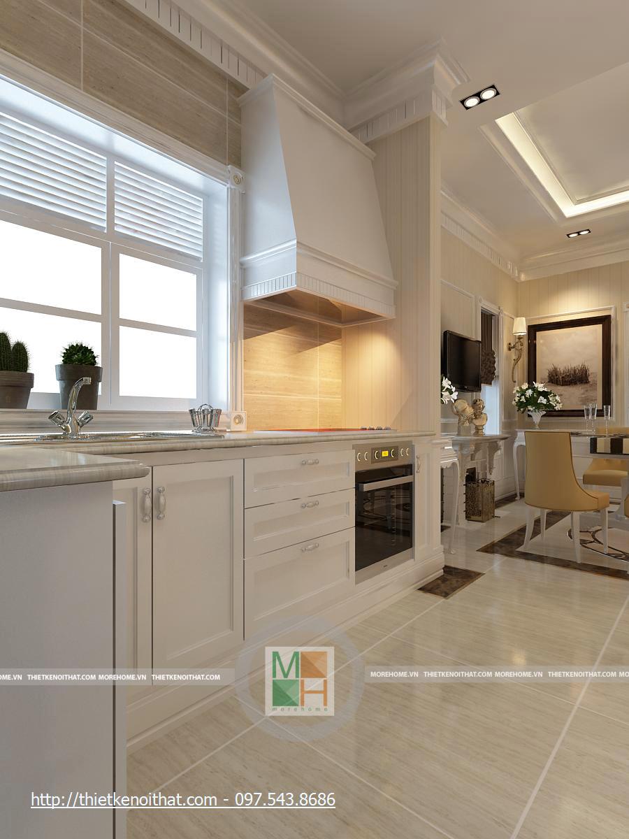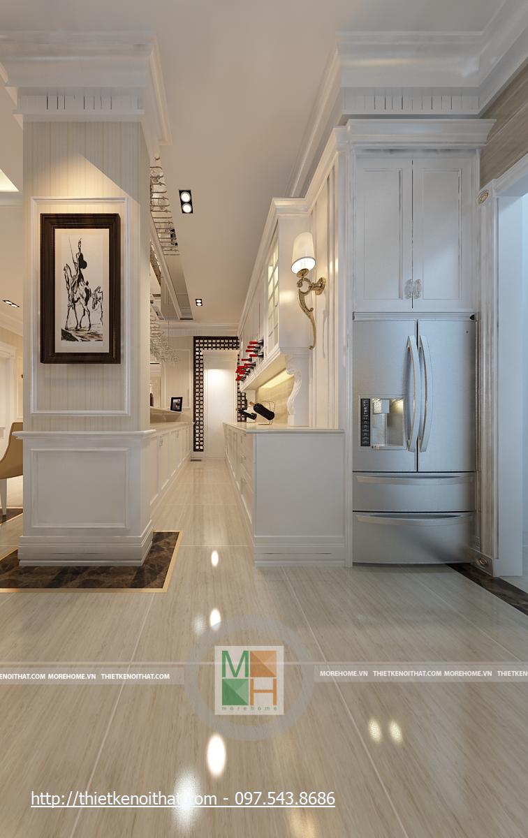 Bên kia hành lang đi lại là khu bếp và bàn ăn. Bộ bàn ăn được thiết kế đơn giản, sắp đặt gọn gàng vì không gian không quá rộng. không gian hiện đại được tôn lên nhờ bộ đèn chùm màu trắng, thiết kế đơn giản. cạnh đó là màn hính lớn gắn trên tường cùng với 2 ô cửa sổ nhỏ tăng thêm ánh sáng cho căn phòng. Bếp nấu được đặt lùi vào trong để tận dụng không gian tối đa. Nội thất trong gian bếp được thiết kế khá đơn giản nhưng vẫn đầy đủ và tiện nghi. Khu bếp được phủ bởi một màu vàng ấm cúng từ sơn tường và các cụm đèn trần, đèn chiếu sáng khu vực nấu ăn, …