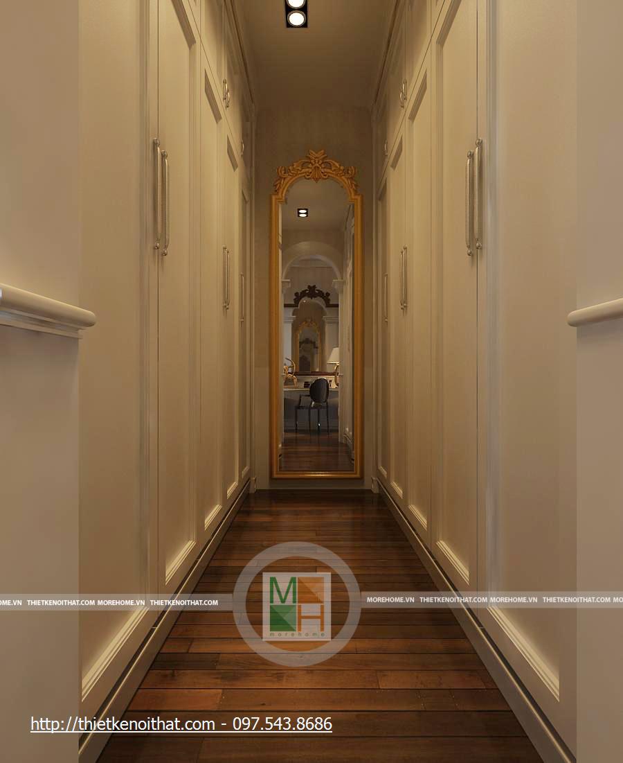 Phòng thay đồ của bố mẹ khá rộng, trong đó có một tủ đồ lớn, choán hết bức tường nơi nó được đặt. Gương lớn, kết hợp với ánh sáng tự nhiên từ cửa sổ khiến cho căn phòng trở nên càng sáng hơn.