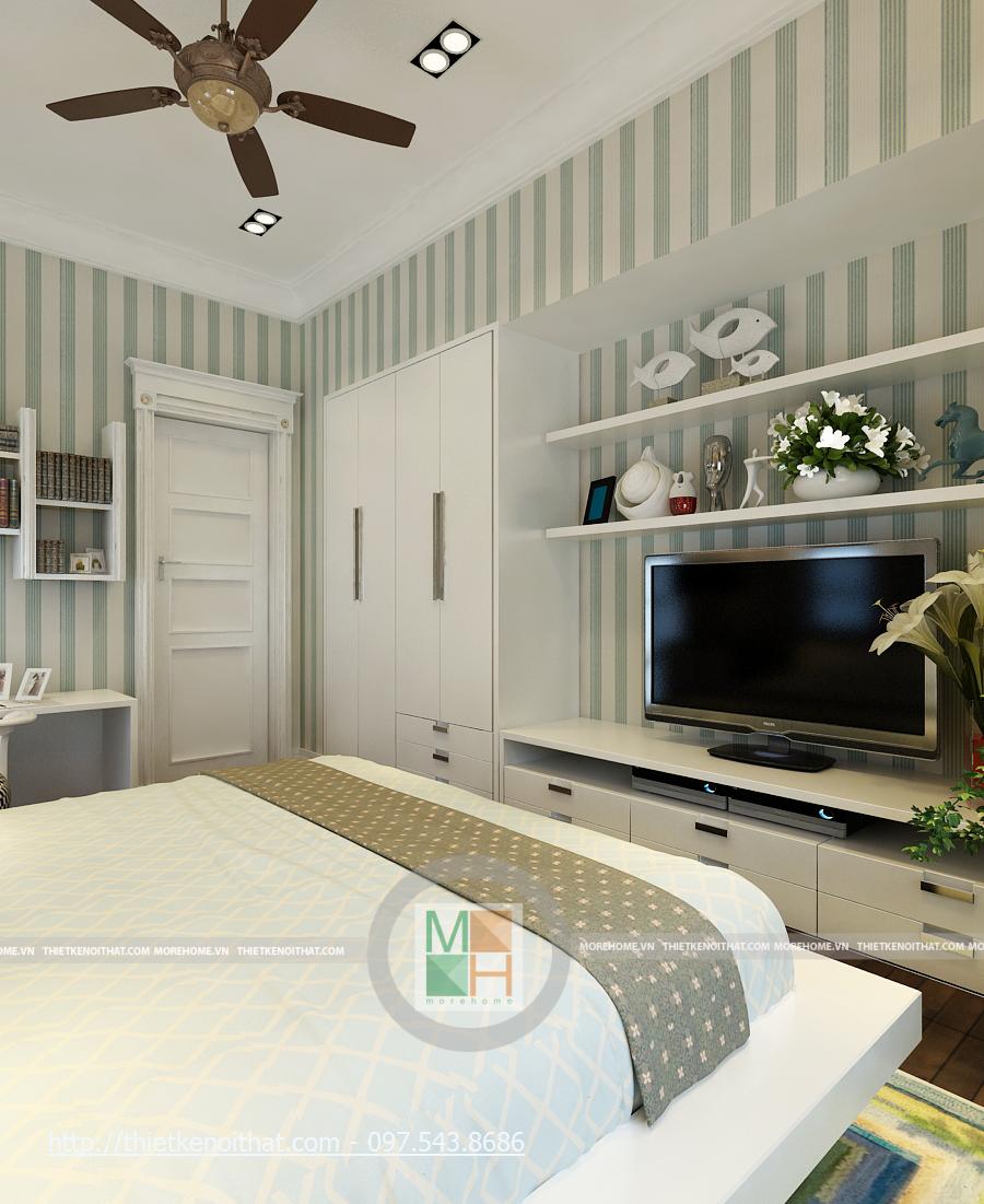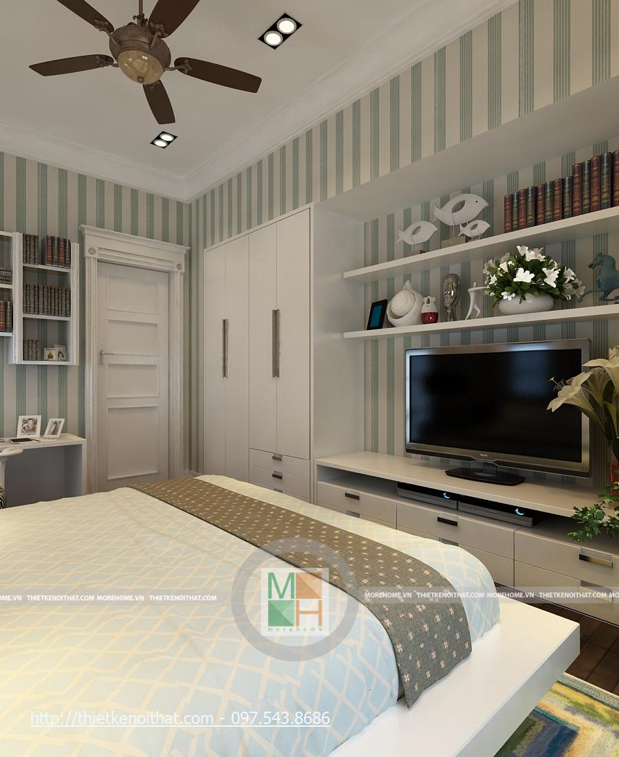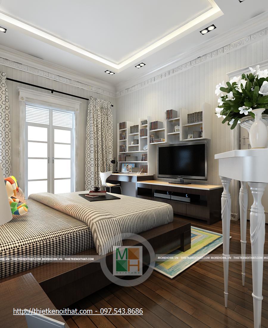 Phòng ngủ con tầng 3 được trang trí khá rực rỡ và trẻ trung. Có một chút giống nhau về nội thất với phòng ngủ của con ở tầng 2. Vẫn là 2 cửa sổ nhỏ cạnh giường, cửa sổ chính lớn và bàn làm việc cạnh đó, màn hình TV được đặt trên kệ đối diện giường. Tuy nhiên một chút màu sắc được đưa vào bộ chăn-ga –gối đã khiến cho căn phòng trẻ nên sinh động và đầy màu sắc. thay vì màu sẫm như phòng ngủ cho con ở tầng 2, chăn ga ở đây được sử dụng những sọc màu vàng kết hợp xanh lơ, tạo nên sự trẻ trung, sáng tạo cho căn phòng. Trền nền vàng ấm nhẹ của căn phòng là những khung tranh nhỏ, giúp cho nên tường không bị nhàm chán và hơn nữa là tăng thêm sự mới mẻ cho căn phòng. Căn phòng được thiết kế dành cho con gái.
