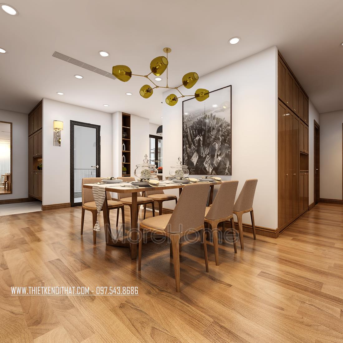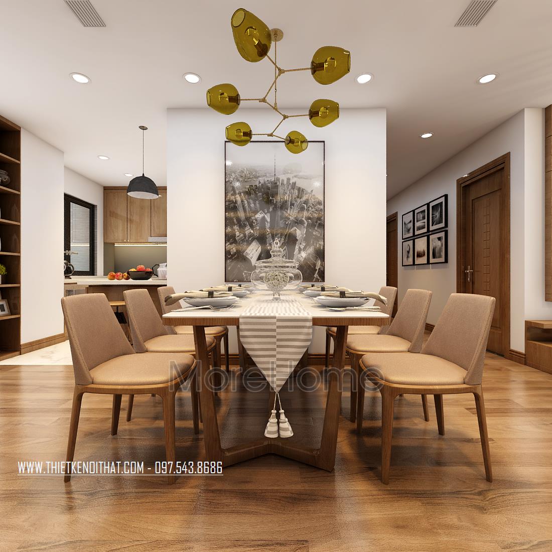 Tiếp theo là thiết kế nội thất khu vực bàn ăn hiện đại. Thiết kế bàn ăn được kiến trúc sư lựa chọn không quá nhỏ phù hợp với nhiều mục đích sử dụng của gia chủ. Hệ thống tủ kệ khu vực này được thiết kế gần như âm tường, các ngăn mở, hay ngăn cửa đóng kết hợp tạo cảm giác đa năng, thuận tiện hơn cho gia chủ. Các điểm nhấn sáng tạo khác như đèn trang trí, chậu cảnh là điểm nhấn đường nét và màu sắc giúp không gian trở nên cuốn hút hơn rất nhiều.
