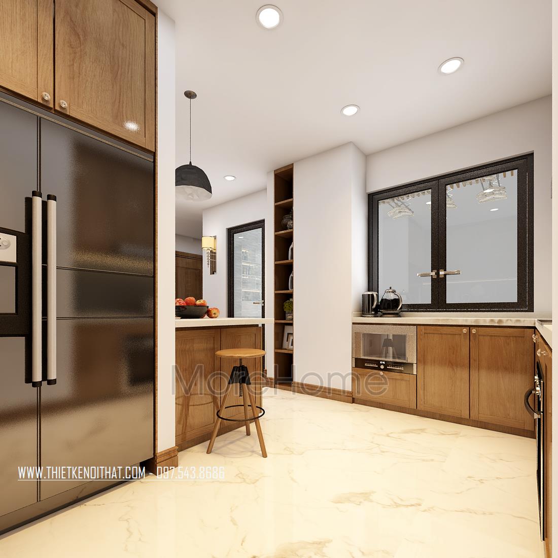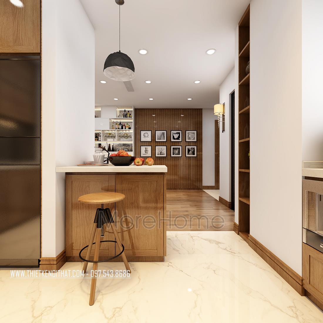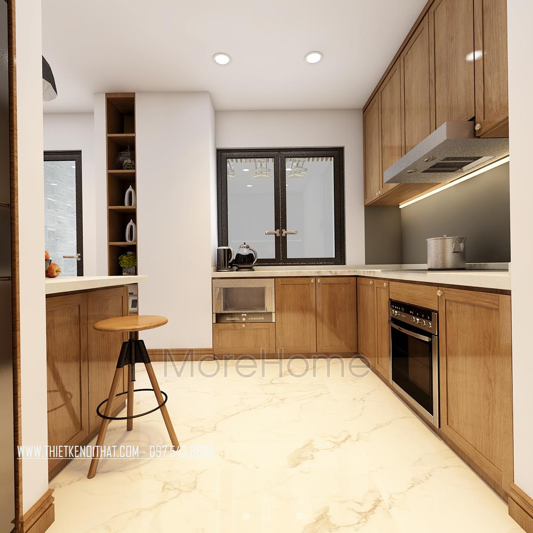 Thiết kế nội thất không gian bếp được kiến trúc sư khéo léo tận dụng ở một khoảng nhỏ của căn hộ, bao quanh tạo thành một không gian riêng biệt, không làm ảnh hưởng hay gây nguy hiểm cho các hoạt động của gia đình. Nhiều phụ huynh luôn lo lắng, căn bếp với khá nhiều vật sắc hay nóng sẽ ảnh hưởng đến hoạt động của trẻ nhỏ, nhưng với thiết kế bao gọn gàng này, các hoạt động của bếp sẽ được giữ một khoảng cách an toàn với không gian chung. Hệ thống tủ kệ kết hợp được thiết kế đơn giản, đa năng giúp không gian vô cùng tiện nghi và ngăn nắp.