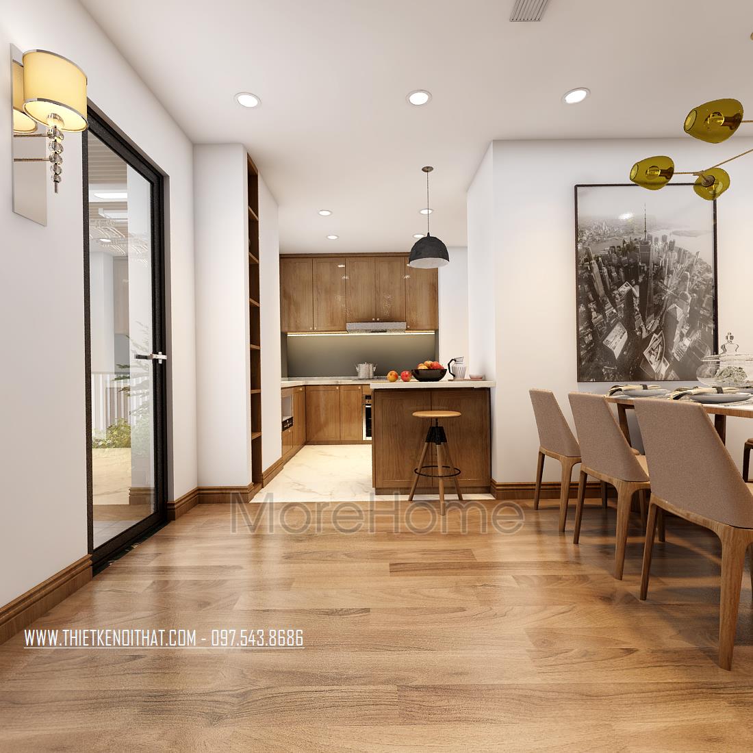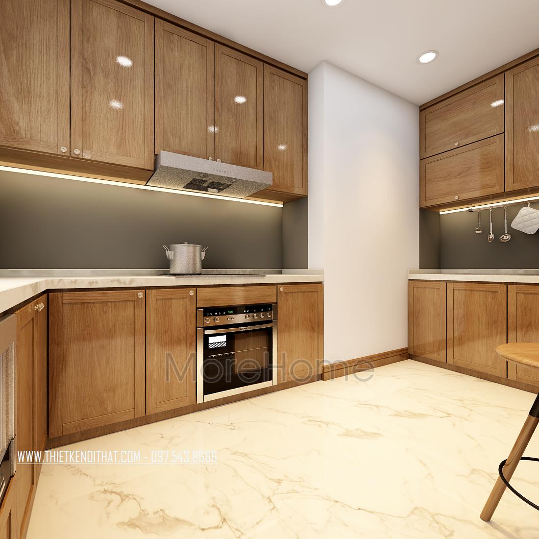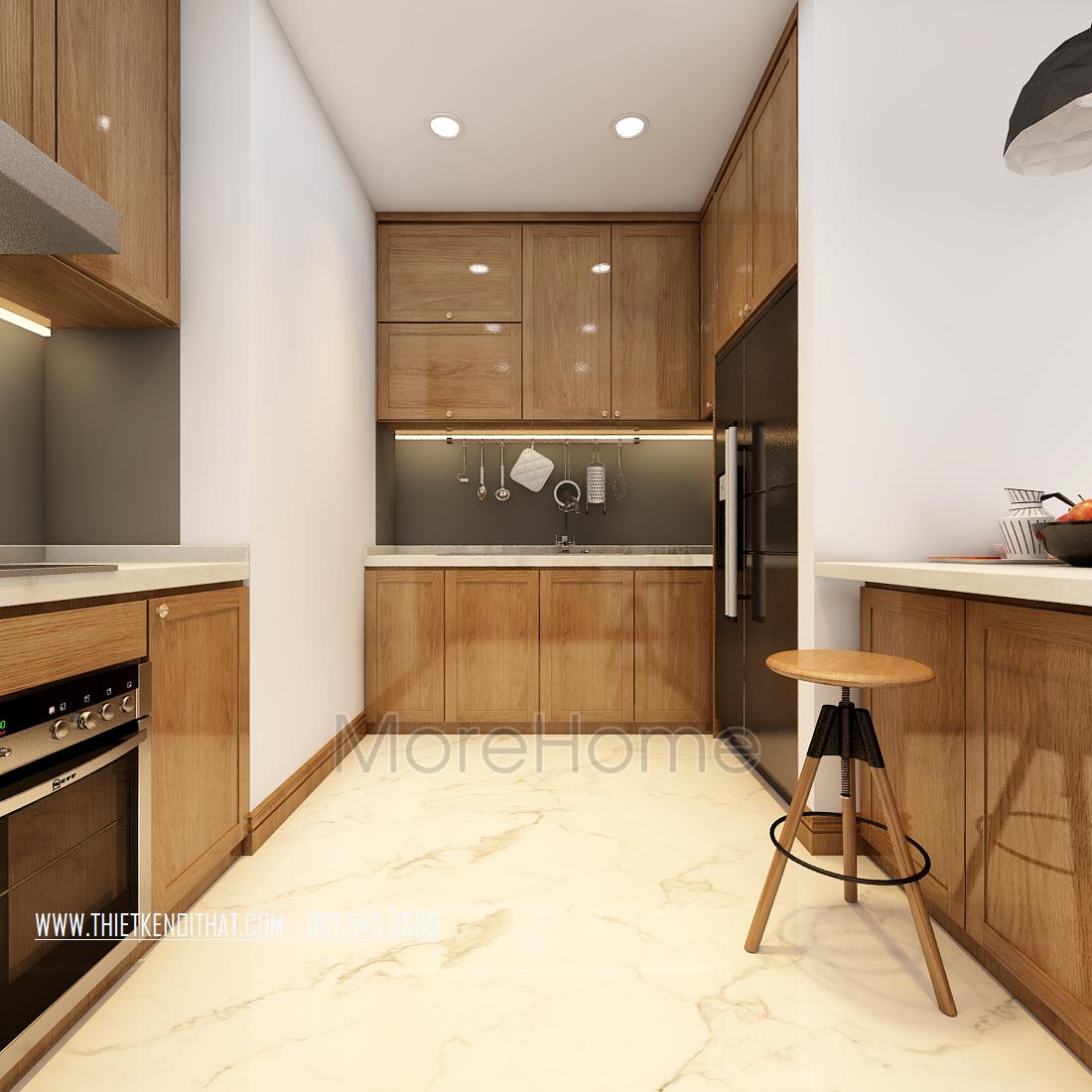Thiết kế nội thất không gian bếp được kiến trúc sư khéo léo tận dụng ở một khoảng nhỏ của căn hộ, bao quanh tạo thành một không gian riêng biệt, không làm ảnh hưởng hay gây nguy hiểm cho các hoạt động của gia đình. Nhiều phụ huynh luôn lo lắng, căn bếp với khá nhiều vật sắc hay nóng sẽ ảnh hưởng đến hoạt động của trẻ nhỏ, nhưng với thiết kế bao gọn gàng này, các hoạt động của bếp sẽ được giữ một khoảng cách an toàn với không gian chung. Hệ thống tủ kệ kết hợp được thiết kế đơn giản, đa năng giúp không gian vô cùng tiện nghi và ngăn nắp.