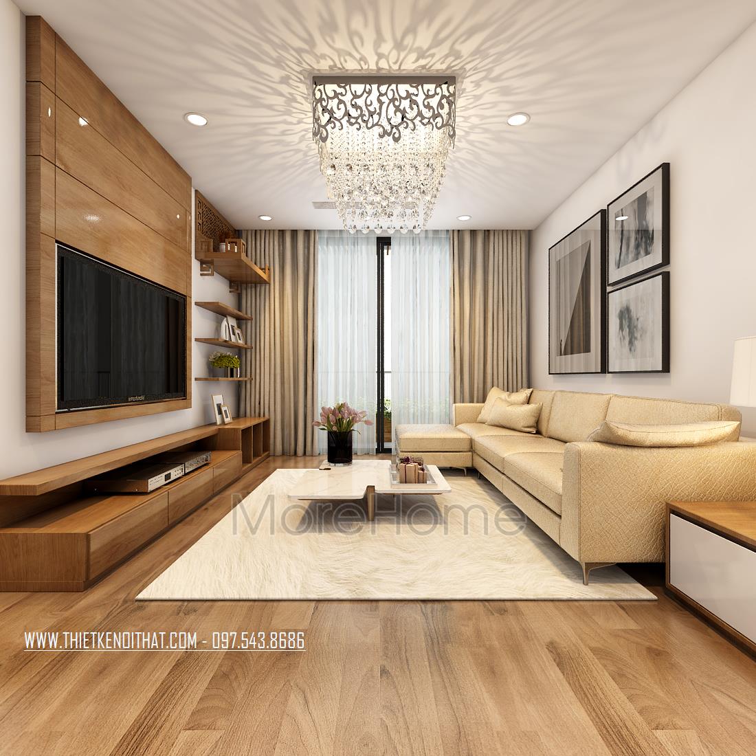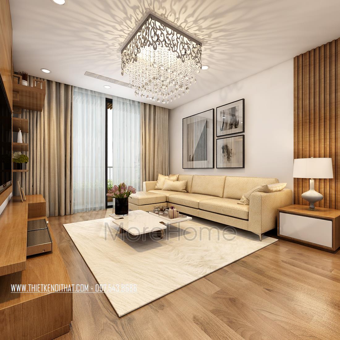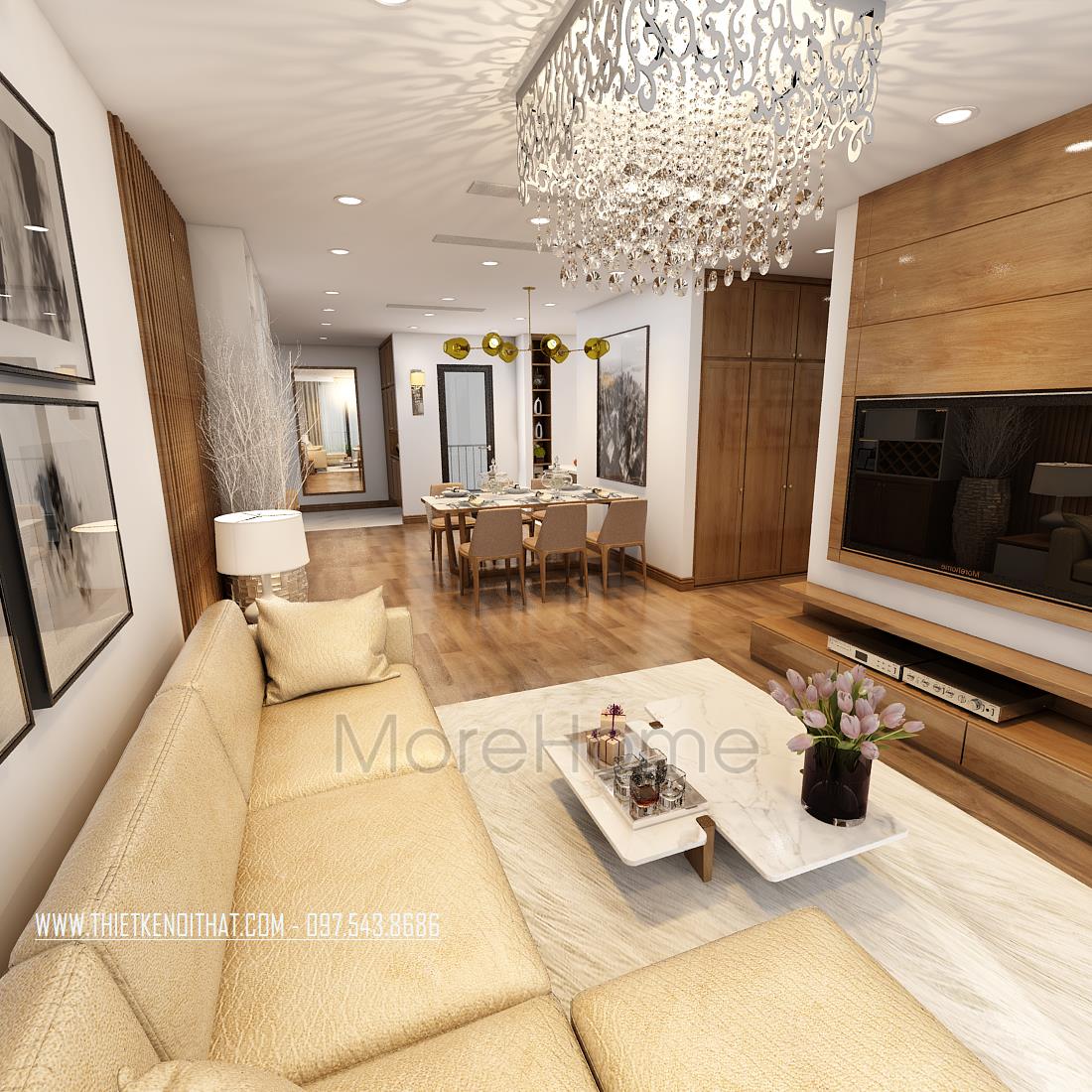 Bằng việc ứng dụng thiết kế phong cách hiện đại, trẻ trung, ấn tượng, căn chung cư Ngoại Giao Đoàn của anh Duật thực sự đã trở thành một chốn đi về, và là niềm tự hào của gia chủ. Thiết kế nội thất phòng khách phong cách hiện đại sử dụng các tone màu be kết hợp nâu dịu mắt làm màu sắc chủ đạo, gợi mở một không gian ấm áp, sum vầy. Thiết kế ghế sofa rộng, to tạo khoảng mở giúp thiết kế trở nên tiện nghi và thoải mái. Điểm đặc biệt của không gian này chính là sự thay thế khéo léo của các thiết kế kệ tủ đồ sộ xưa cũ bằng các thiết kế thanh ngang đơn giản, từ đó vừa đảm bảo tính công năng lại giúp tiết kiệm đáng kể diện tích sử dụng.