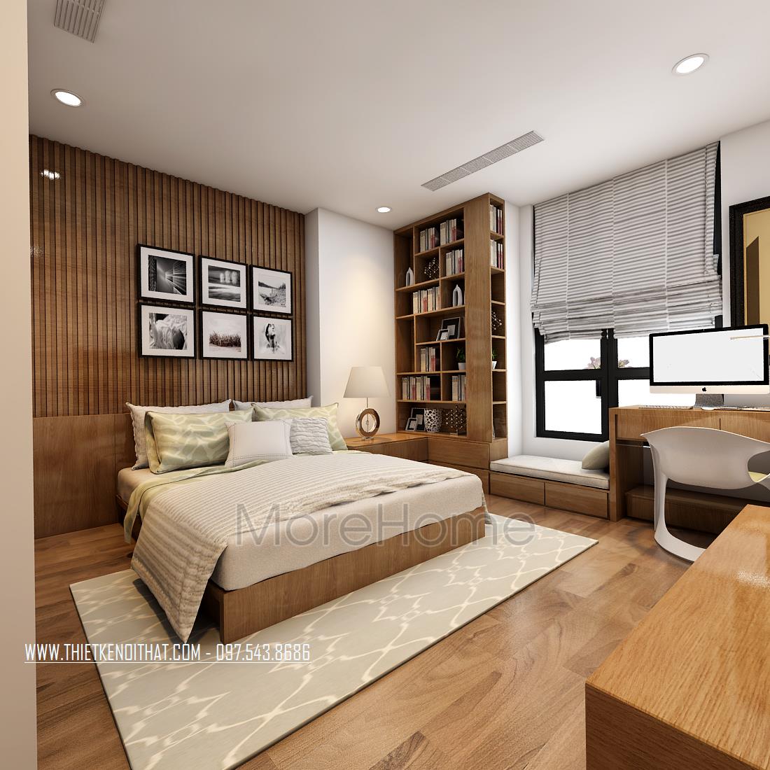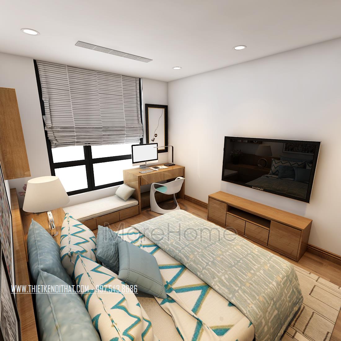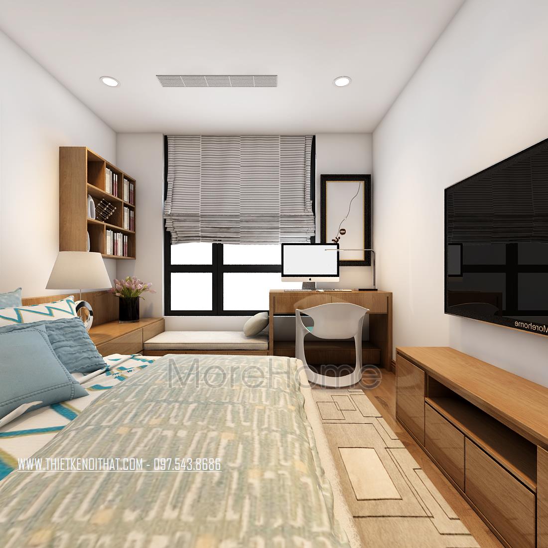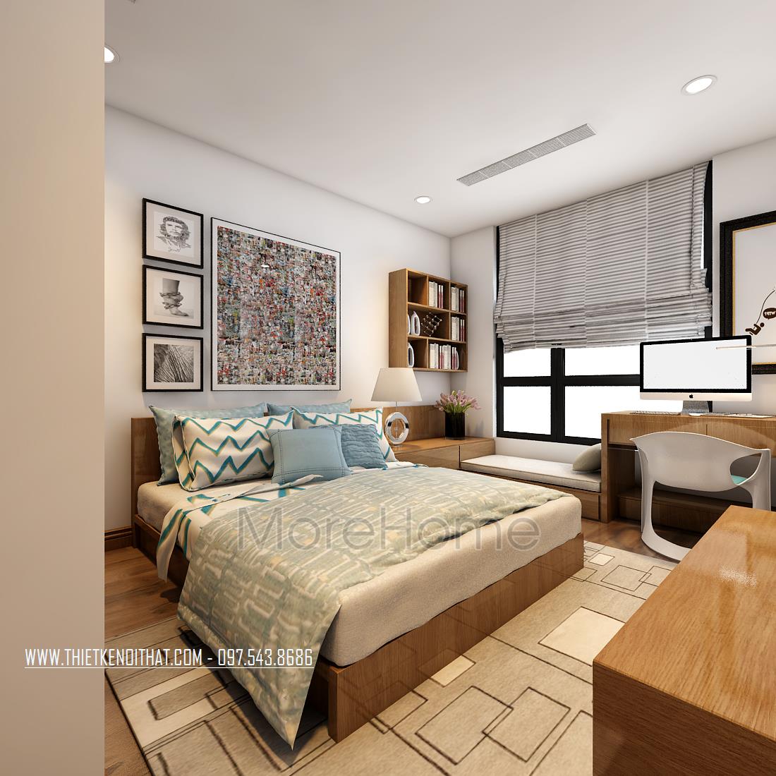 Tiếp theo là thiết kế nội thất phòng ngủ phong cách hiện đại phù hợp với mỗi thành viên. Các tone màu sử dụng vẫn là những tone màu nhẹ nhàng, tuy nhiên sự biến đổi một chút từ nâu sáng ấm áp đến xanh nước biển dịu nhẹ giúp không gian trở nên đặc trưng và phù hợp hơn với từng lứa tuổi và sở thích của gia chủ. Các kệ tủ kết hợp được đặt khéo léo tạo khoảng trống cho căn phòng. Một căn phòng nhỏ ấm áp không thể thiếu ánh sáng, tận dụng vị trí thuận lợi, khung cửa sổ rộng mở luôn là điểm đặc biệt của mỗi căn phòng, đặc biệt kiến trúc sư còn khéo léo sắp xếp đặt một kế băng dài tạo không gian đọc sách ấn tượng.