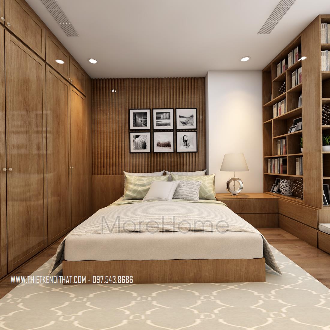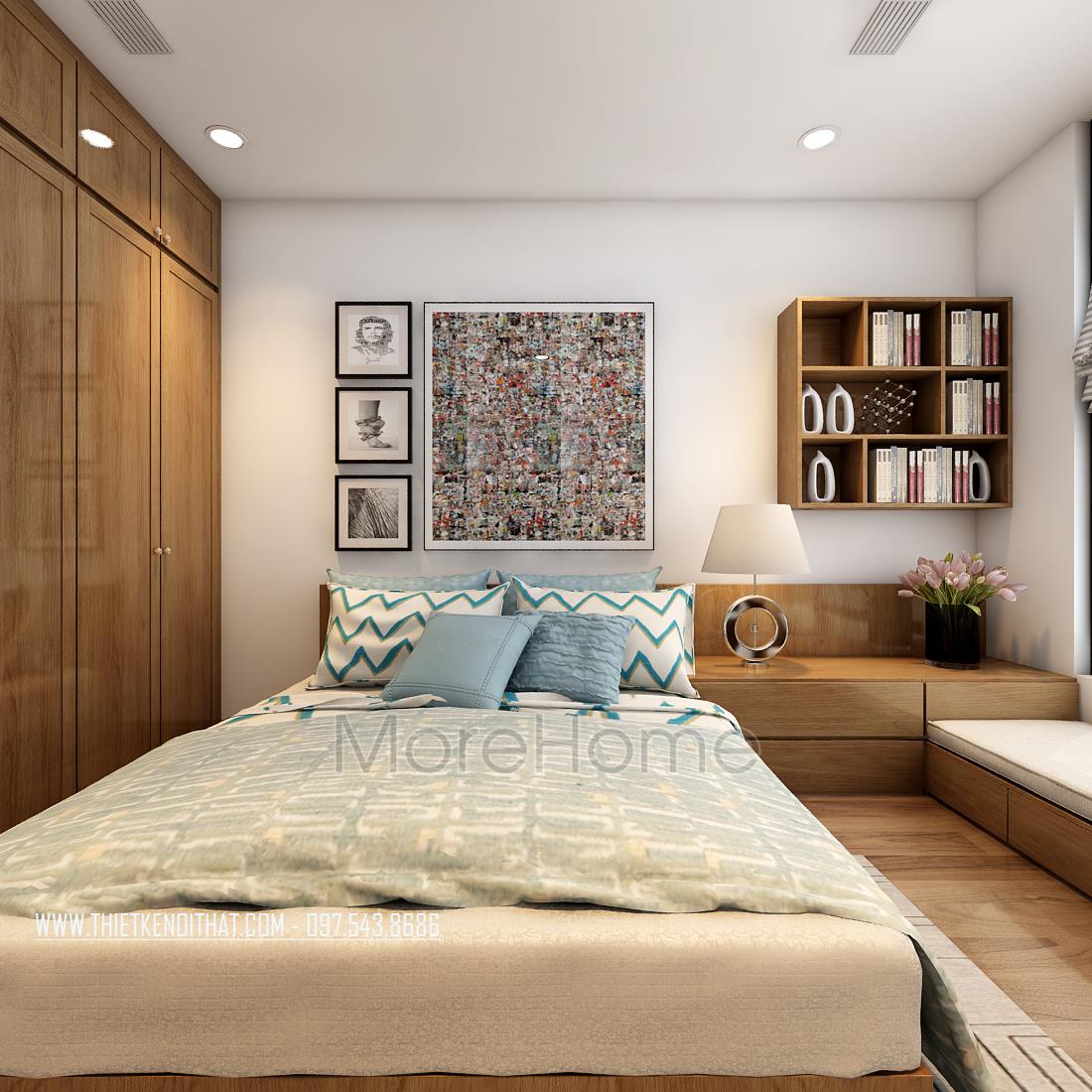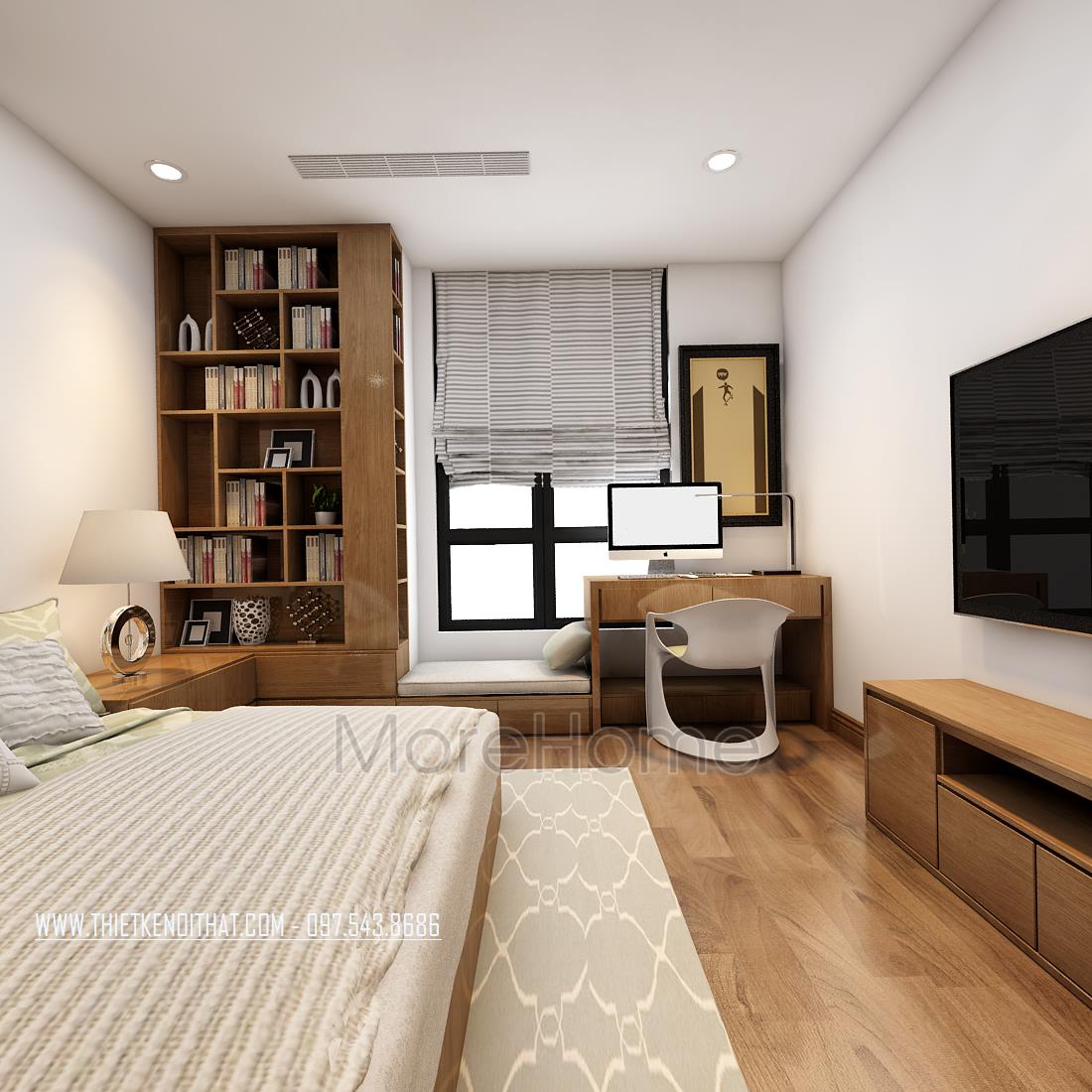 Tiếp theo là thiết kế nội thất phòng ngủ phong cách hiện đại phù hợp với mỗi thành viên. Các tone màu sử dụng vẫn là những tone màu nhẹ nhàng, tuy nhiên sự biến đổi một chút từ nâu sáng ấm áp đến xanh nước biển dịu nhẹ giúp không gian trở nên đặc trưng và phù hợp hơn với từng lứa tuổi và sở thích của gia chủ. Các kệ tủ kết hợp được đặt khéo léo tạo khoảng trống cho căn phòng. Một căn phòng nhỏ ấm áp không thể thiếu ánh sáng, tận dụng vị trí thuận lợi, khung cửa sổ rộng mở luôn là điểm đặc biệt của mỗi căn phòng, đặc biệt kiến trúc sư còn khéo léo sắp xếp đặt một kế băng dài tạo không gian đọc sách ấn tượng.