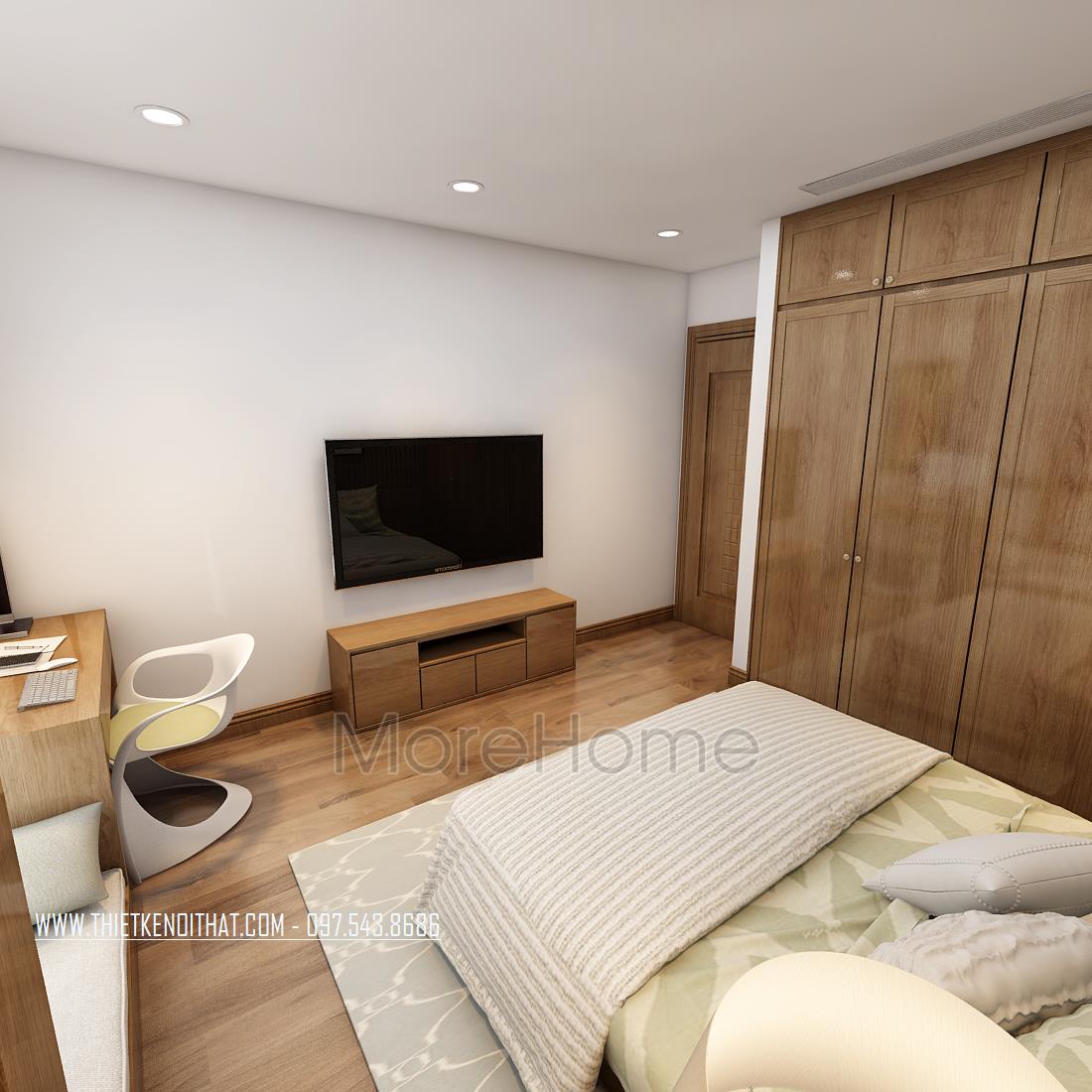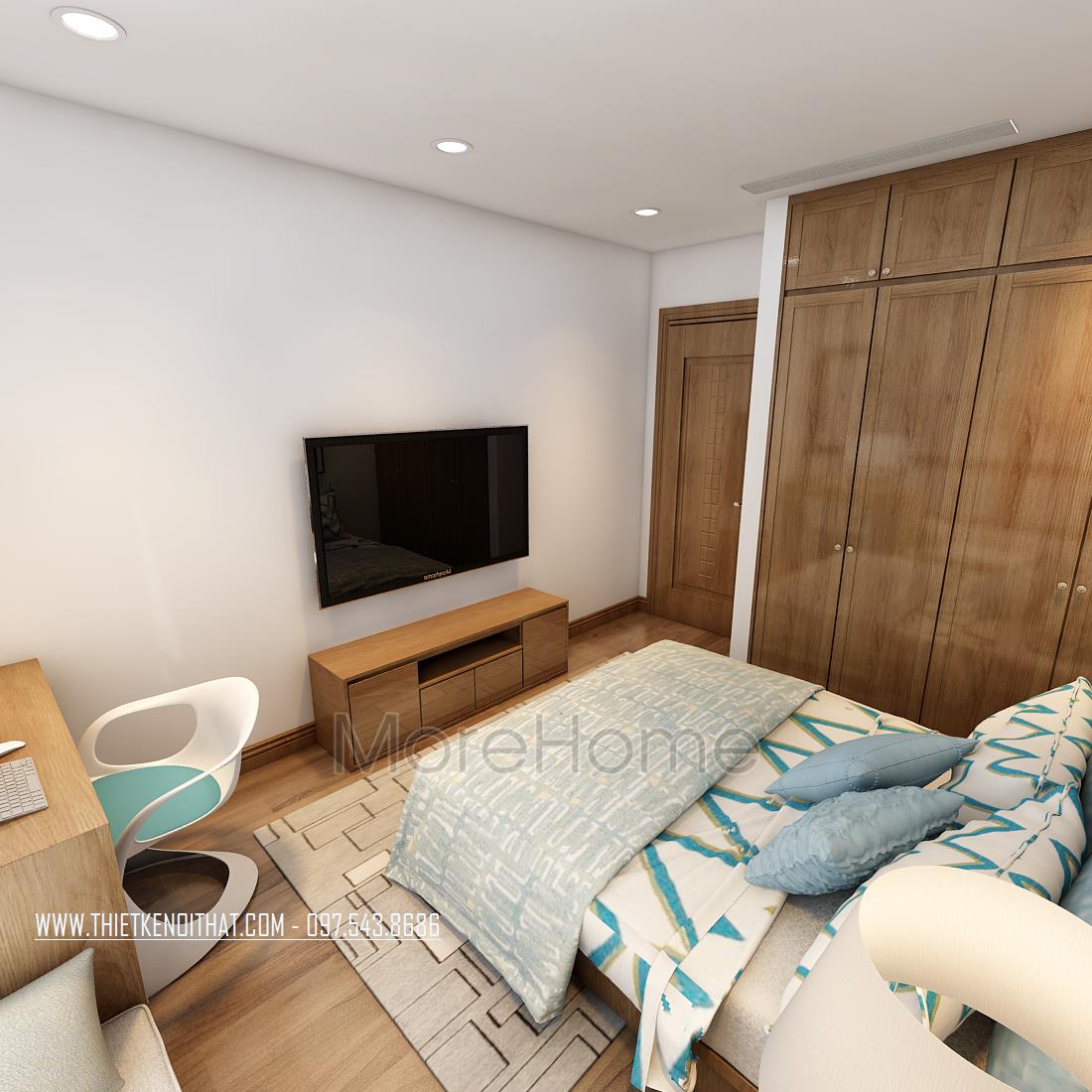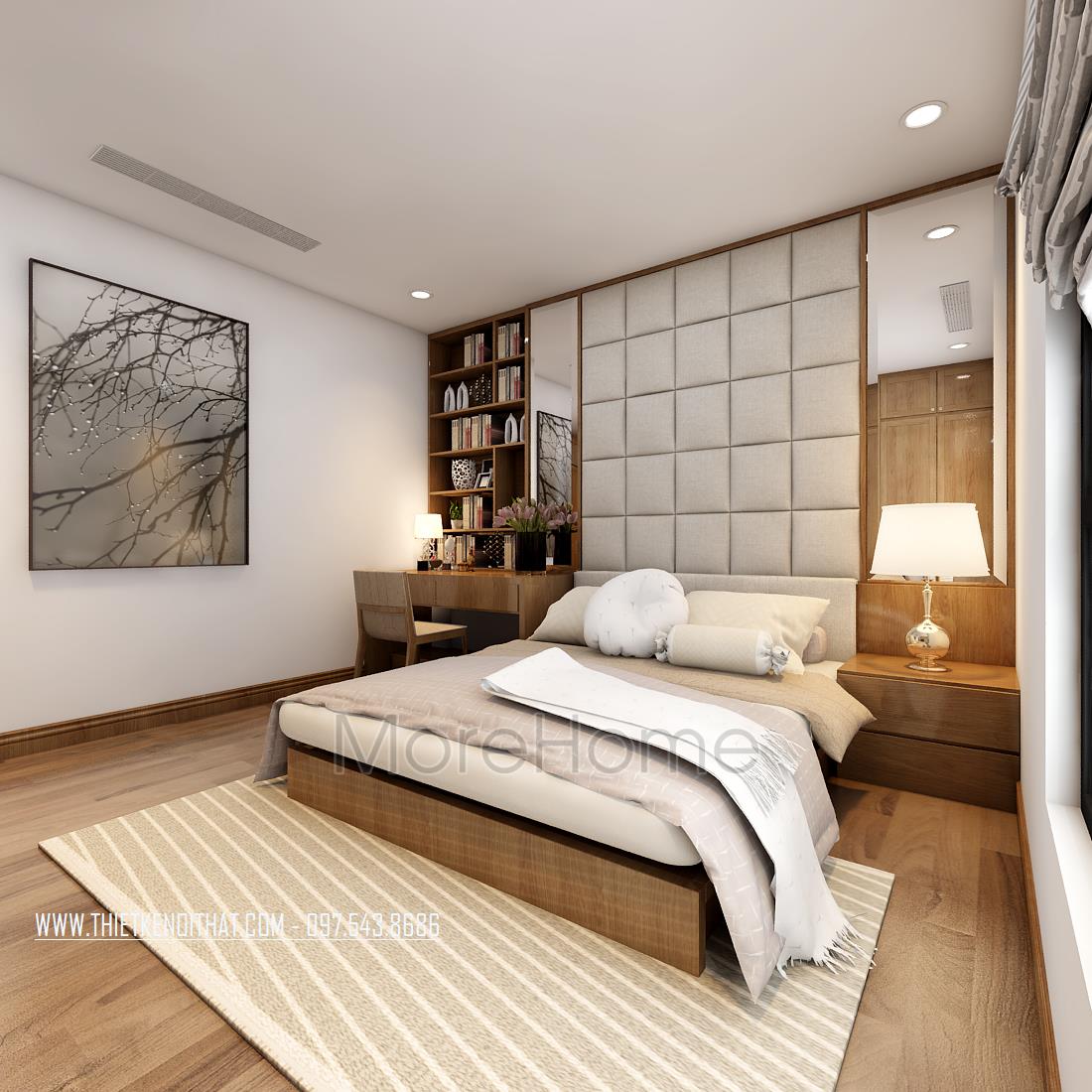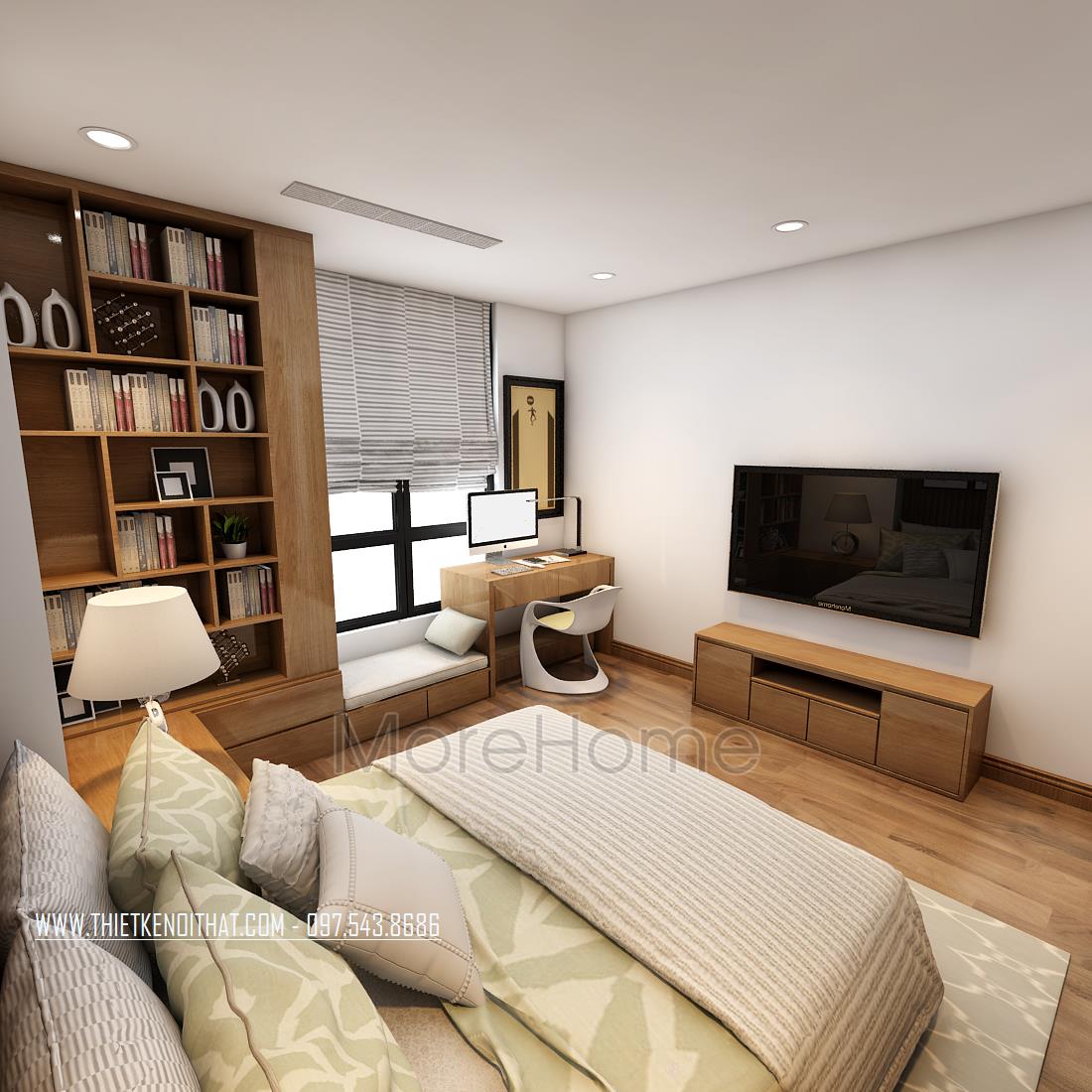 Tiếp theo là thiết kế nội thất phòng ngủ phong cách hiện đại phù hợp với mỗi thành viên. Các tone màu sử dụng vẫn là những tone màu nhẹ nhàng, tuy nhiên sự biến đổi một chút từ nâu sáng ấm áp đến xanh nước biển dịu nhẹ giúp không gian trở nên đặc trưng và phù hợp hơn với từng lứa tuổi và sở thích của gia chủ. Các kệ tủ kết hợp được đặt khéo léo tạo khoảng trống cho căn phòng. Một căn phòng nhỏ ấm áp không thể thiếu ánh sáng, tận dụng vị trí thuận lợi, khung cửa sổ rộng mở luôn là điểm đặc biệt của mỗi căn phòng, đặc biệt kiến trúc sư còn khéo léo sắp xếp đặt một kế băng dài tạo không gian đọc sách ấn tượng.