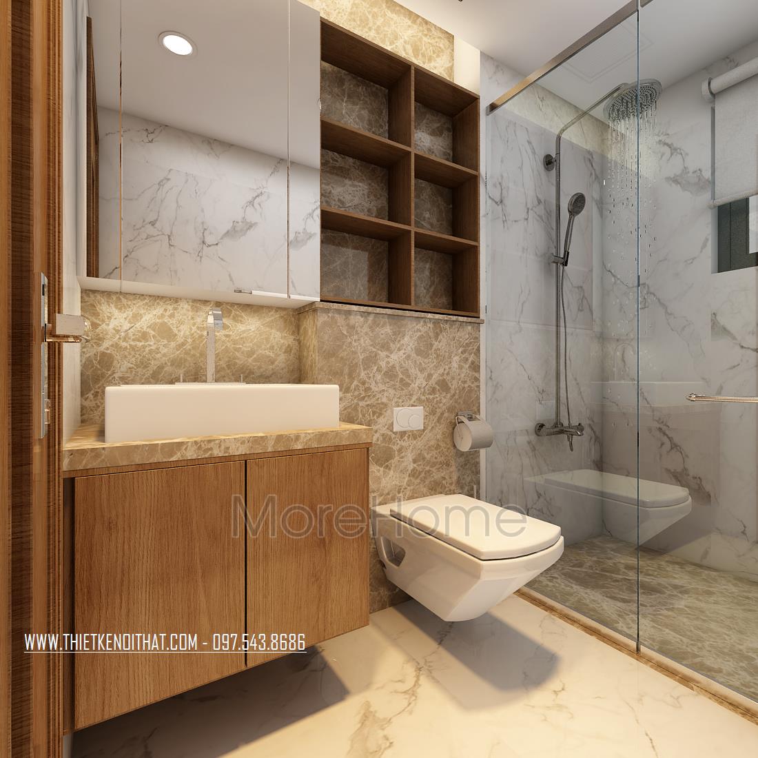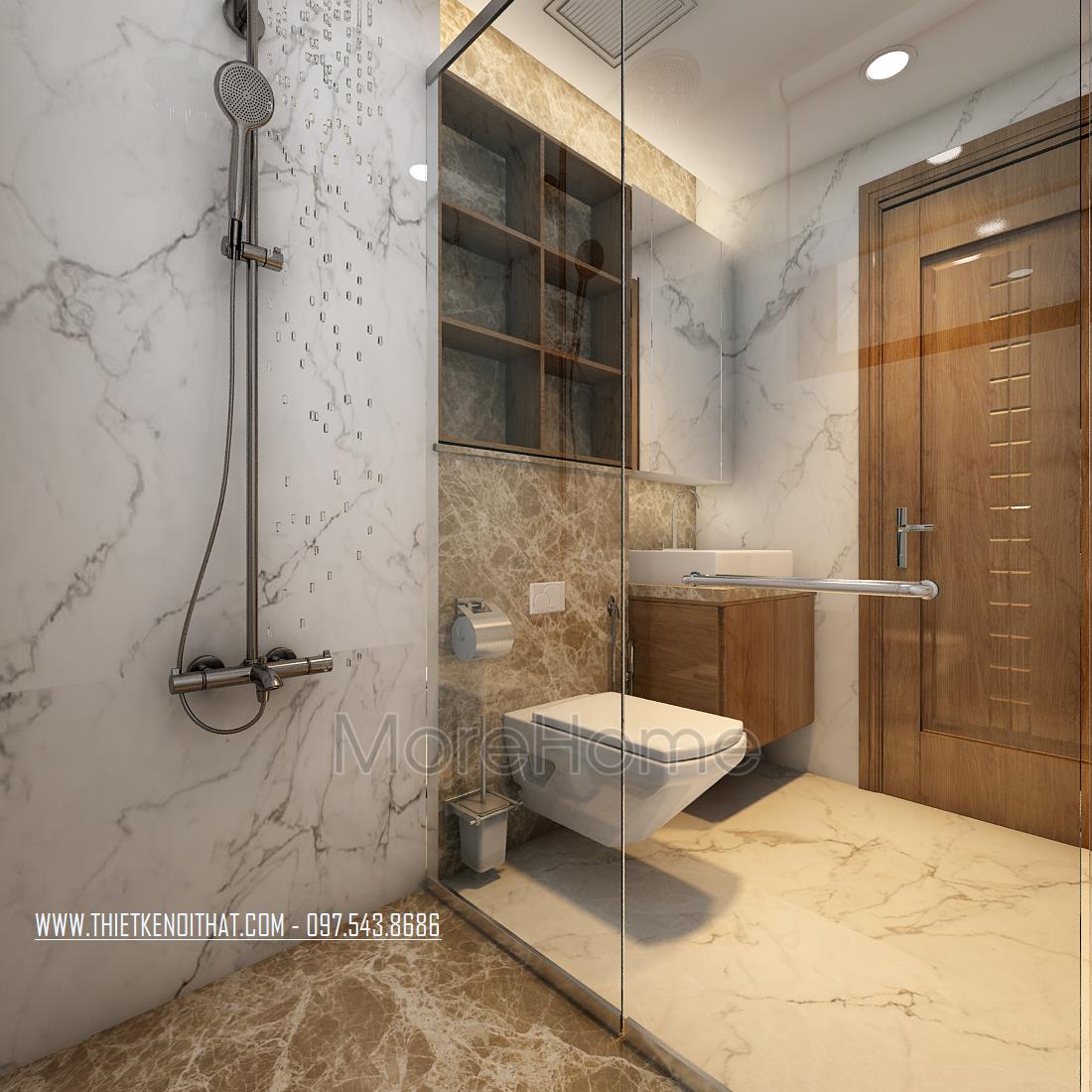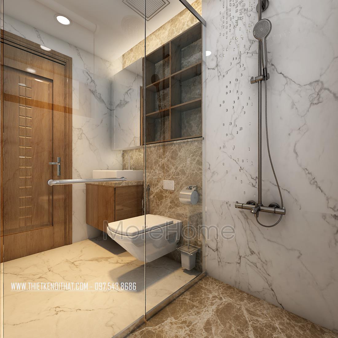 Cuối cùng là thiết kế nội thất nhà vệ sinh hiện đại, sang trọng. Với đầy đủ các thiết kế nội thất vệ sinh tiện nghi, căn phòng mang nhỏ mang đến sự hài lòng cho bất kỳ gia chủ nào. Nhờ thiết kế ứng dụng các vật liệu nhẹ như kính cường lực, gỗ tự nhiên, đá vân sáng màu, giúp tạo độ phản chiếu vừa phải cho không gian, vừa tăng tính thẩm mỹ cho thiết kế lại giúp không gian trở nên mở và tạo cảm giác cơi nới cho phong hẹp.